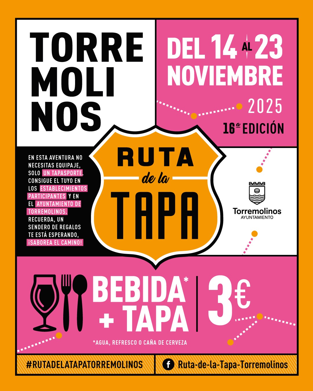 Más de treinta establecimientos de restauración participanen la XVI Ruta de la Tapa de Torremolinos, que se celebrará del 14 al 23 de noviembre, ambosinclusive, y en la que los establecimientos ofrecerán una bebida (agua, refresco, vino o caña de cerveza) y una tapa elaborada por el precio de 3 euros, siendo la oferta válida dentro del horario de cocina habitual del establecimiento.